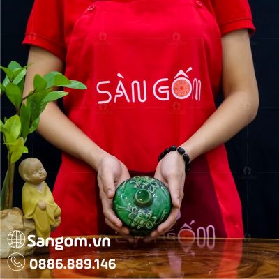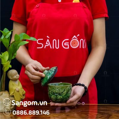 Bát nắp thờ đựng nước men ngọc lục bảo họa tiết hoa sen SG-BNT05