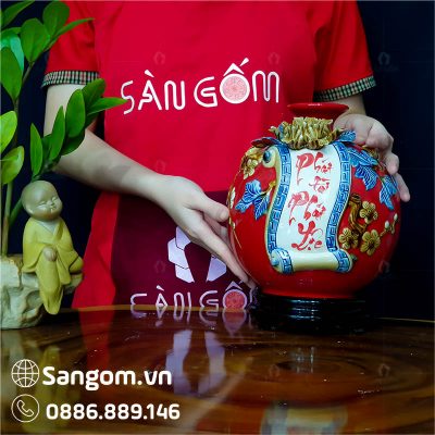 Không giống với các sản phẩm thông thường là in hoặc vẽ trên bề mặt. Sản phẩm được các nghệ nhân chăm chút tỉ mỉ với hoạ tiết Cuốn thư Phát tài phát lộc đắp nổi đặc sắc.