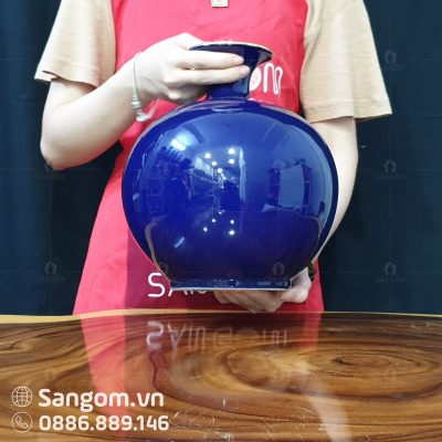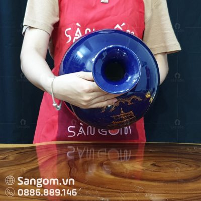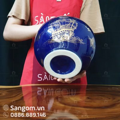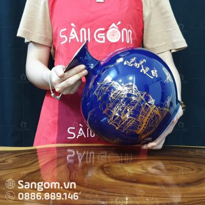 Bình hút lộc này có màu xanh dương tao nhã, dịu dàng làm chủ đạo đủ để làm nổi bật cái sắc vàng của chiếc thuyền. Đây là tác phẩm được chăm chuốt một cách tỉ mỉ từ những hoa tiết dù là nhỏ nhất bằng đôi bằng tay tài hoa và điêu luyện của nghệ nhân làng gốm.