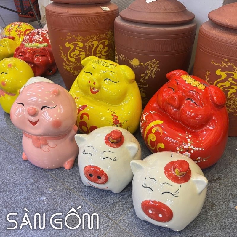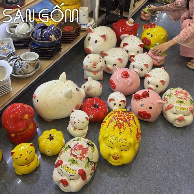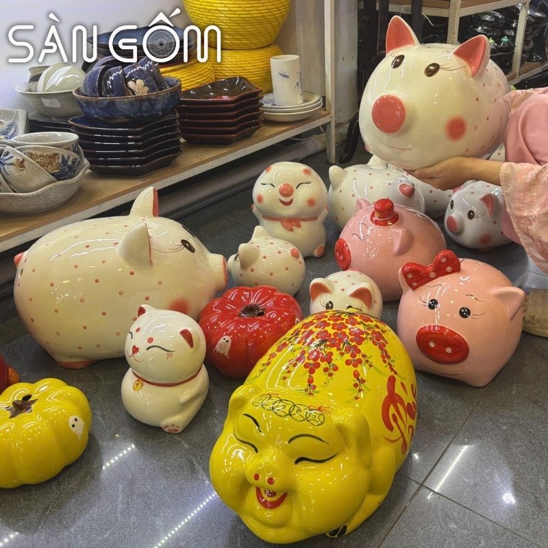 Đặc biệt tại Bát Tràng còn có những mẫu heo đất tài lộc, phú quý mang ý nghĩa sung túc được thiết kế với nhiều kích cỡ và màu sắc khác nhau, đủ để đáp ứng nhu cầu làm quà tân gia.