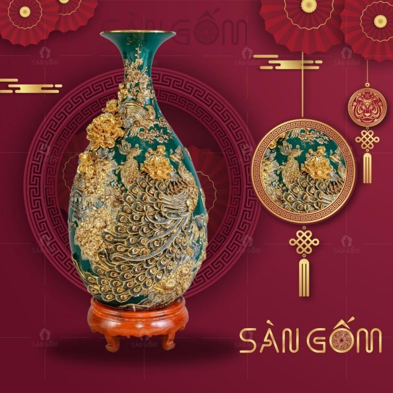 Lọ tỳ bà “Công- Đào” màu xanh ngọc đắp nổi vẽ vàng 24k SG-LTB01 là một sản phẩm bình trang trí phong thủy tuyệt vời được rất nhiều khách hàng ưu thich tại Sàn Gốm Bát Tràng . Một sản phẩm có giá trị nghệ thuật và phong thủy cao, với những họa tiết nổi bật là một vật phẩm đáng để sở hữu.