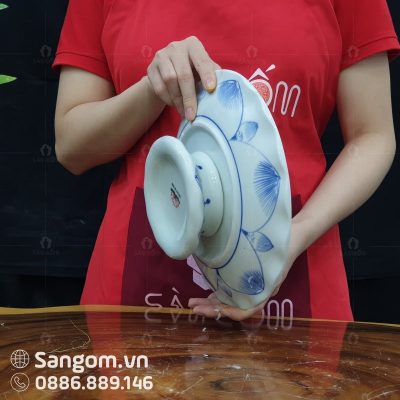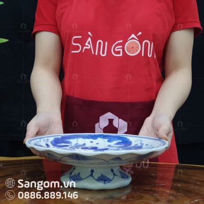 Bình hoa thờ Bát Tràng men lam miệng lượn vẽ hoa sen SG-LHT03