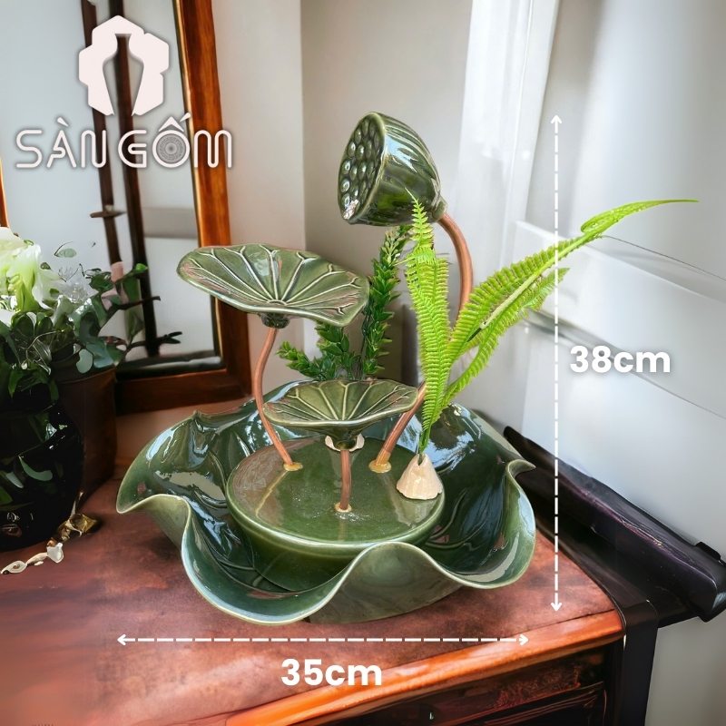 - Kích Thước Lý Tưởng: Với chiều cao 38cm và đường kính lu chậu 35cm, thác nước có kích thước phù hợp để đặt trên bàn làm việc, kệ sách, bàn trà phòng khách hoặc tab đầu giường, tạo điểm nhấn ấn tượng mà không chiếm quá nhiều diện tích.